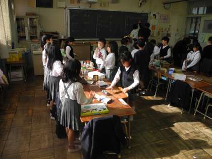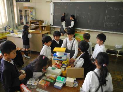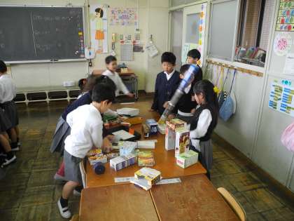 4時間目、1年2組は」図画工作科で「かたちあそび」をしました。様々な形の空き箱を組み合わせて「トラック」や「お城」などを作ります。班で協力して、楽しそうに作っていました。