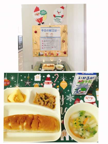 今日から、給食室の展示食ブースは、クリスマスバージョンです☆