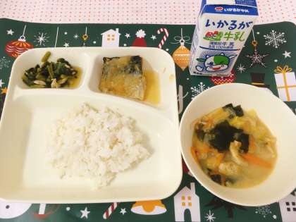【ごはん、さばのみぞれかけ、みそ汁、こまつなの煮びたし、牛乳】