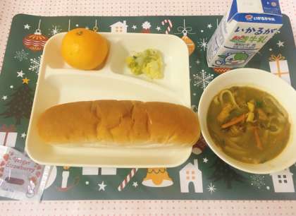【カレーうどん、はくさいの甘酢あえ、みかん、コッペパン、いちごジャム、みかん】