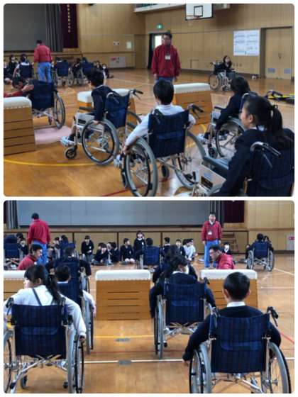 車椅子「触ってみよう」「乗ってみよう」「友だちを乗せてみよう」という体験授業。