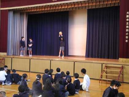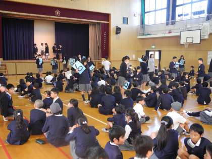 講堂の幕の間を横切るものを、班で協力して当てます。難しかったのは「名札」。小さくて見えにくかったようです。