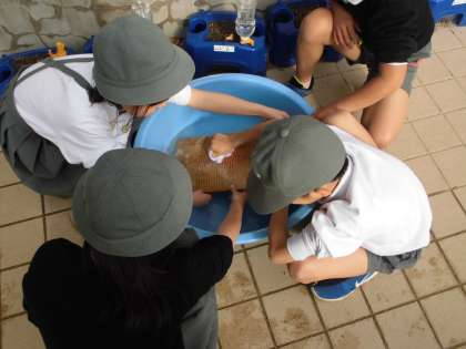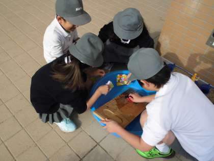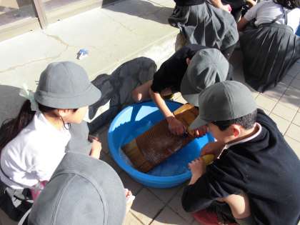 社会の学習でせんたく板を使いました。せんたく板のギザギザの部分でハンカチをこすり、冷たい水で洗い流しました。水はとても冷たく、昔の人の大変さを実感することができました。