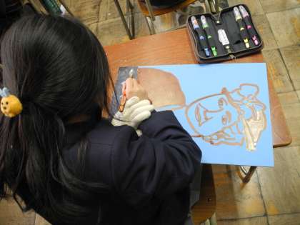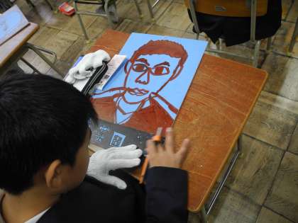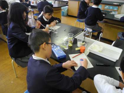 1月14日 5時間目、5年1組は図工科で版画の学習をしていました。けがをしないように、軍手をはめて慎重に彫っていきます。5年2組は理科、「もののとけ方」の実験です。