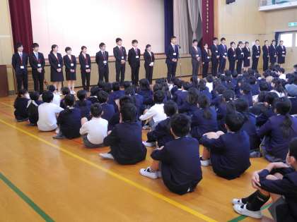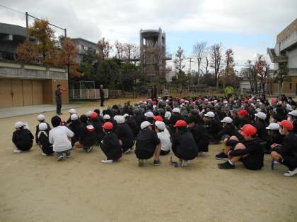 1月15日、今年4月から大阪市の小学校に採用される予定の先生方が、茨田小学校に研修にやってきました。朝会であいさつし、避難訓練や掃除にも参加していただきました。