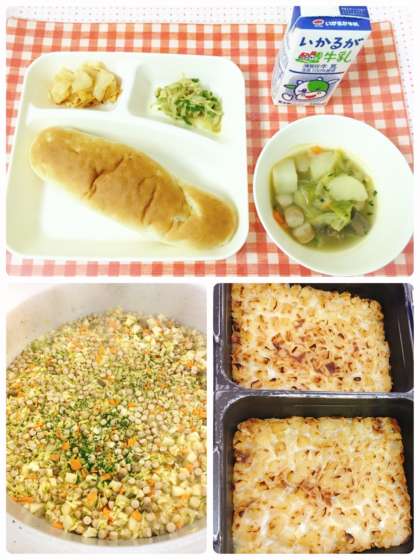 【ポトフ、カレーソテー、桃のクラフティ、おさつパン、牛乳】