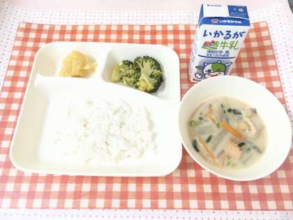 【ごはん、かす汁、ブロッコリーのしょうがづけ、くりきんとん、牛乳】