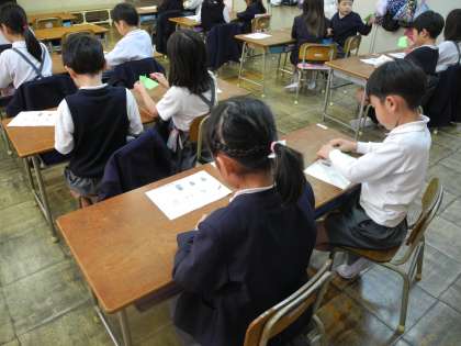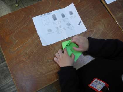 1月20日 5時間目、1年1組は生活科の学習でパッチンカエルを作っていました。折り方が難しく、教えあって作っていました。4年2組は版画の下絵を描いていました。自分の写真をもとにして、丁寧に少しづつ進めていました。