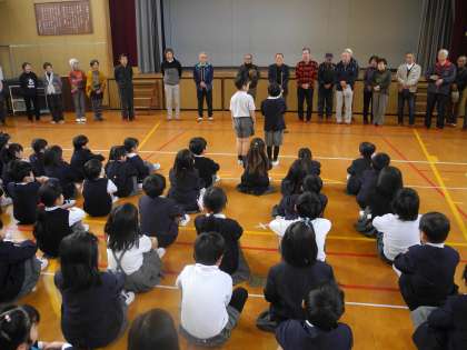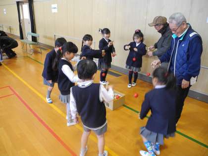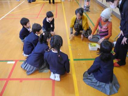 1月21日、茨田連合の老人会のみなさんに来ていただき、1年生が昔あそびを体験しました。