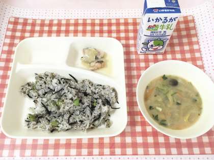 【栄養たっぷりえだまめひじきご飯、さけのさわやかレモン焼き、冬野菜のみそ汁、牛乳】