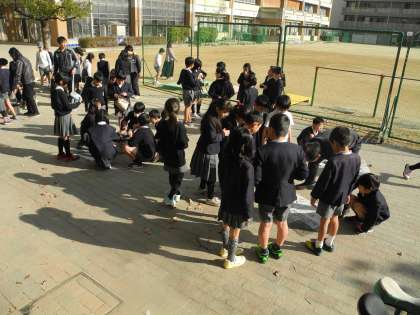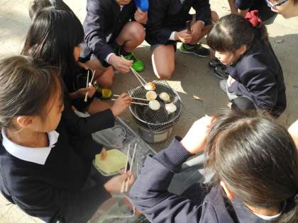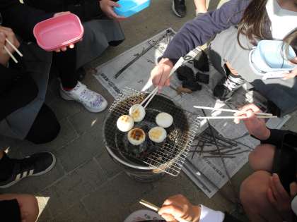 1月22日 2・3時間目、3年生は社会科の学習で「七輪体験」をしました。炭をおこしてお餅を焼きました。こんがりと焼き上がり、美味しそうに食べていました。