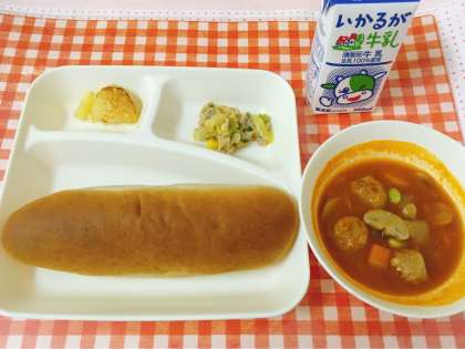 【ミートボールのケチャップ煮、ツナと野菜のソテー、焼きじゃが、黒糖パン、牛乳】