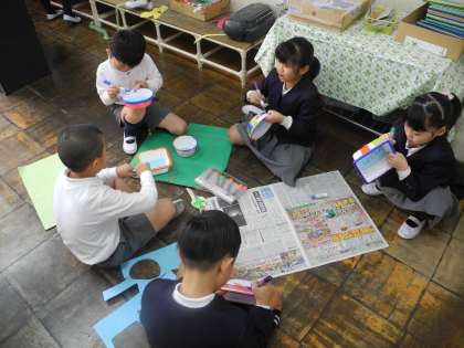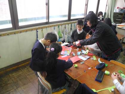 1時間目、2年1組は来週の「おもちゃまつり」の準備をしていました。だいぶ出来上がってきました。教室から出ようとすると、楽しい?立札が!