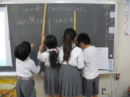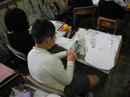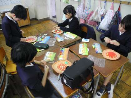 1月29日 3時間目 2年1組では紙版画の下書きをしていました。出来上がりが楽しみです。2年2組は算数科の授業で「長さ」の学習です。1mものさしを使って教室の中のいろいろな場所の長さを測りました。3年2組は紙粘土でピザを作っていました。おいしそうに出来ました。