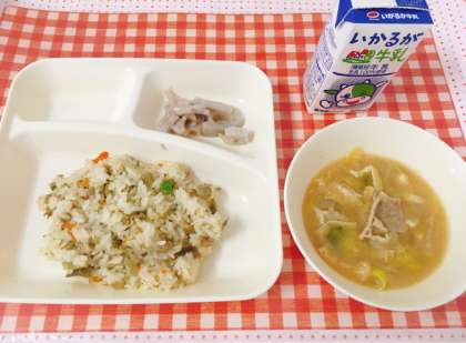 【鶏ごぼうご飯、みそ汁、焼きれんこん、牛乳】