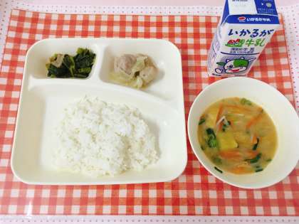 【ごはん、鶏肉のゆず塩焼き、さつまいものみそ汁、こまつなの煮びたし、牛乳】