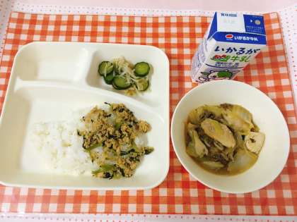 【ごはん、すき焼き煮もやしときゅうりのしょうがづけ ツナっ葉いため、牛乳】