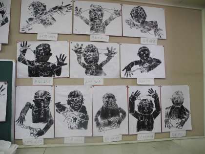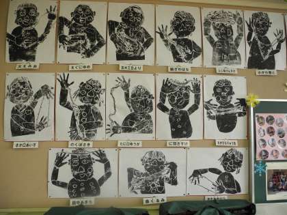 2年生は紙版画。あやとりをしているところです。手や毛糸が上手に表現できました。