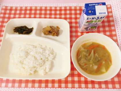 【ごはん、まぐろの甘辛焼き、豚汁、くきわかめのつくだ煮】