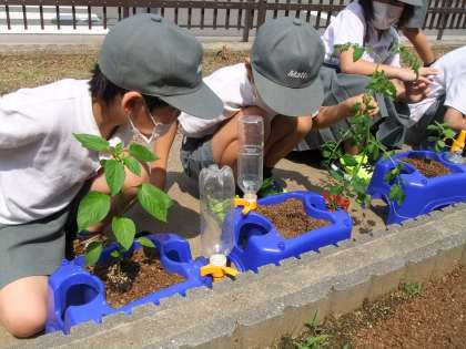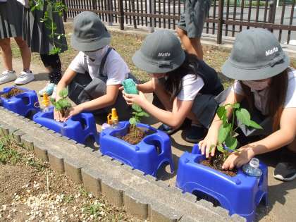 ミニトマト・ピーマン・オクラ・枝豆・ナスの中から好きな野菜を選び、一人ひとりの植木鉢に植えました。大きく育ちますように。