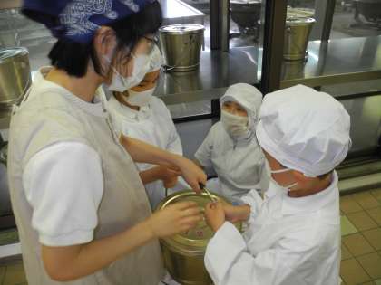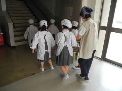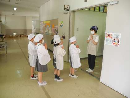 6月9日(火)今週から1年生の子どもたちも給食当番を始めました。給食室に行って、しっかりごあいさつができました。