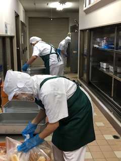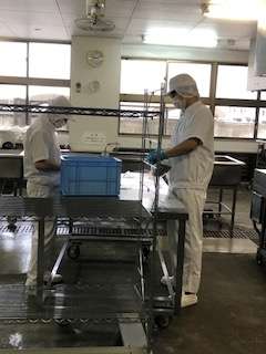 調理員さんたちはパン、牛乳やきざみのりをクラスごとに分ける作業をしていました。