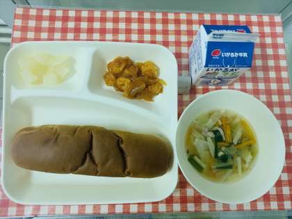 「えびのチリソース・中華スープ・和なし・黒糖パン・牛乳」です。