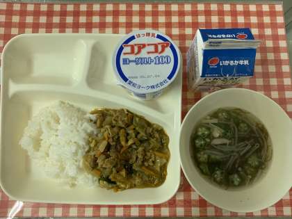 「和風カレー丼・もずくとオクラのとろり汁・ヨーグルト・ごはん・牛乳」です。