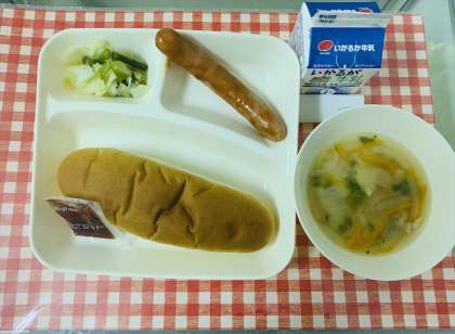 「ウインナーのケチャップソース・スープ・キャベツとさんどまめのサラダ・いちごジャム・コッペン・牛乳」です。