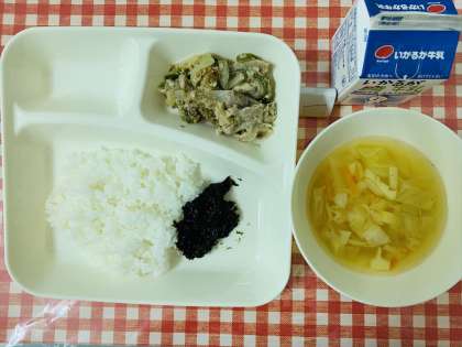 「豚肉のごまみそ焼き・すまし汁・のりのつくだ煮・ごはん・牛乳」です。