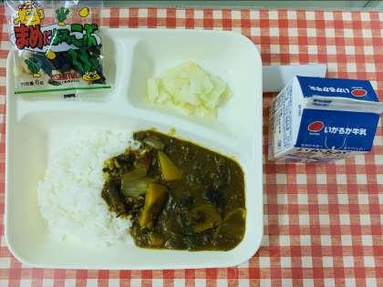 「夏野菜のカレーライス・キャベツのサラダ・豆こんぶ・牛乳」です。