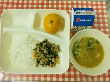「豚ミンチとニラのそぼろ丼・オクラのみそ汁・冷凍みかん・牛乳」です。