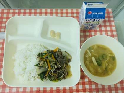 「牛丼・とうがんのみそ汁・大福豆(おおふくまめ)の煮もの・牛乳」です。
