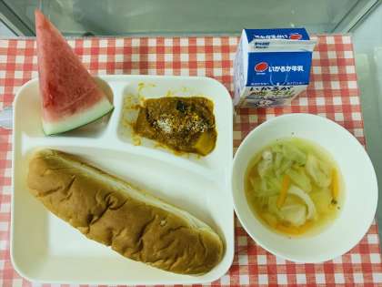 「かぼちゃのミートグラタン・スープ・すいか・おさつパン・牛乳」です。
