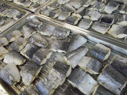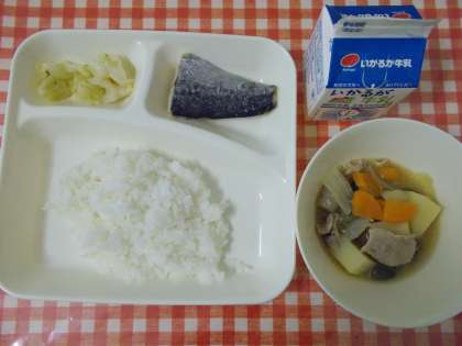 【ごはん、さごしの塩焼き、豚肉とじゃがいもの煮もの、キャベツの梅風味、牛乳】