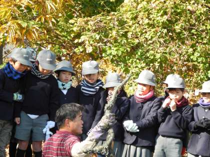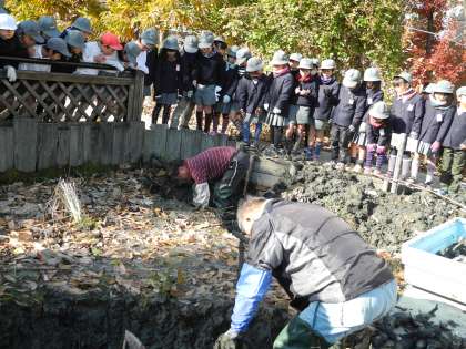地域の綿世さん、堤中さんにきていただき、れんこん掘りをしました。泥にはいってのなかなか骨のおれる作業です。お2人は土の表面を見て、どのあたりにれんこんの地下茎があるかを当てることができるほどの達人です。泥の中から立派なれんこんがつながってでてきたときは、見学の2年生から思わず「でっかい」という声と拍手がおこりました。た。