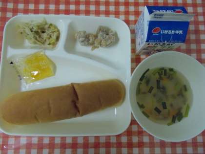 【鶏肉のからあげ、とうがんの中華スープ、切り干し大根のごま辛みづけ、コッペパン、マーマレード、牛乳】