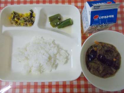 【ごはん、マーボーなす、オクラの甘酢あえ、ツナとチンゲンサイのいためもの、牛乳】