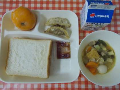 【食パン、いちごジャム、揚げぎょうざ、中華煮、冷凍みかん、牛乳】