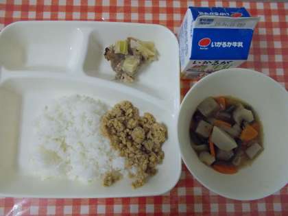 【ごはん、豚肉のねぎじょうゆ焼き、ふきよせ煮、ツナ大豆そぼろ、牛乳】