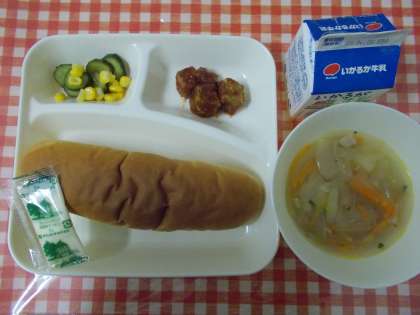 【コッペパン、マーガリン、まぐろのオーロラ煮、ベーコンとじゃがいものスープ、きゅうりとコーンのゆずドレッシング、牛乳】