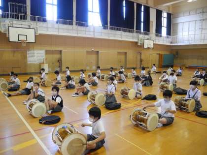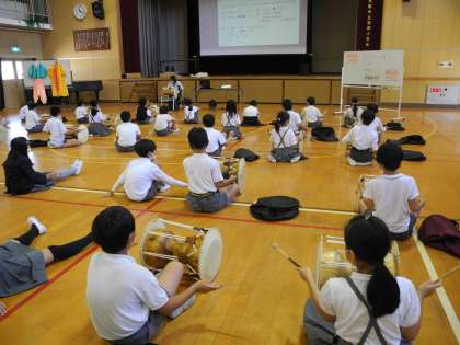 10月12日(月)5年生は韓国・朝鮮の文化について、ソンセンニムから楽器「チャンゴ」の演奏を教わりました。「チャンゴ」は雨の音を表します。左右にバチを持ち、気持ちを合わせて演奏しました。