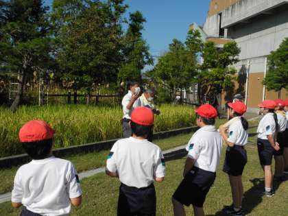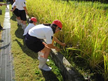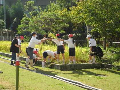 10月12日(月)1時間目、5年2組の子どもたちはすくすくの森の田んぼで稲刈りをしました。田植えをしてから少しずつ大きく育った稲。9月には稲穂が垂れるようになってきました。一人ひとり鎌を手に、ていねいに稲を刈りました。