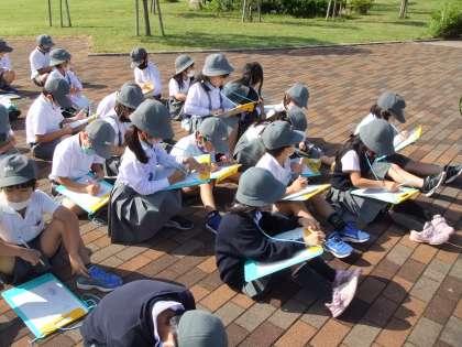 2年生は、鴻池スカイランドに行きました。何が見えるかな、どんな音がきこえるかなと考えて、ワークシートに書きました。