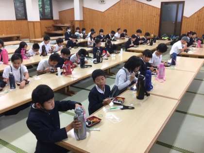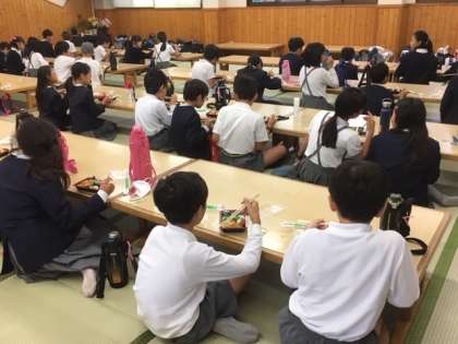 お昼ごはんはご用意いただいたお弁当です。活動班でアルコール消毒をして、分かれて座ります。あいさつをしておいしくいただきました。