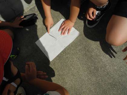 理科の「かげと太陽」の学習で、影と太陽の動きの学習をしています。紙とストローで作った観察の道具を使って、1日3回記録します。影の動きにとても驚いた様子でした。