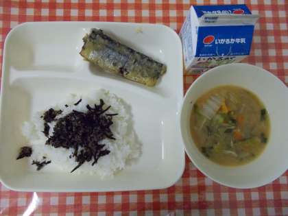 【ごはん、さんまのみぞれかけ、みそ汁、牛ひじきそぼろ、牛乳】