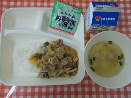 【ピリ辛丼、中華スープ、ソフト黒豆、牛乳】