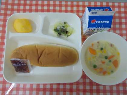 【コッペパン、いちごジャム、コーンクリームシチュー、キャベツと三度豆のサラダ、平種無柿、牛乳】