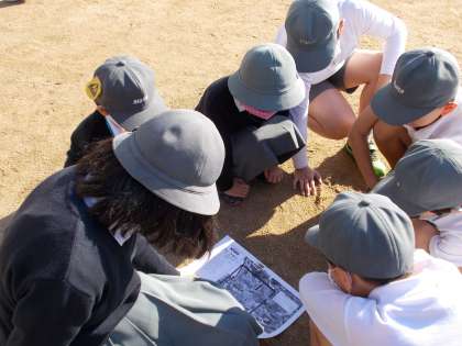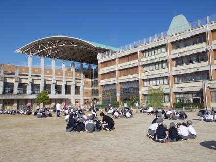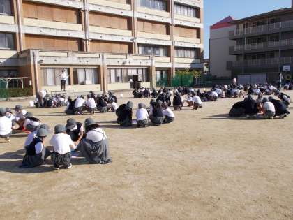鶴見緑地のウォークラリーのため、運動場でなかよし班集会をしました。